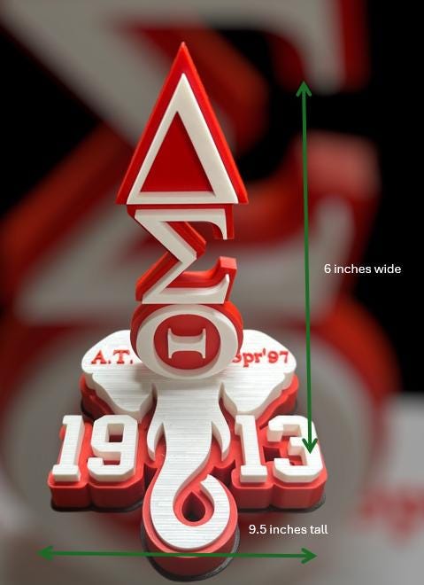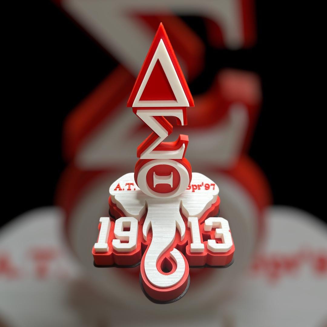 This 3d printed desk statuette is perfect to represent you sorority! Red and white, 3D printed design. Large, stylized numbers "1913" in white, with a red base. The founding year is bold and prominent. A top the base, a detailed shield of the Delta Sigma Theta, with a white design on a red letters. The emblem is meticulously detailed, incorporating a central image and decorative elements.